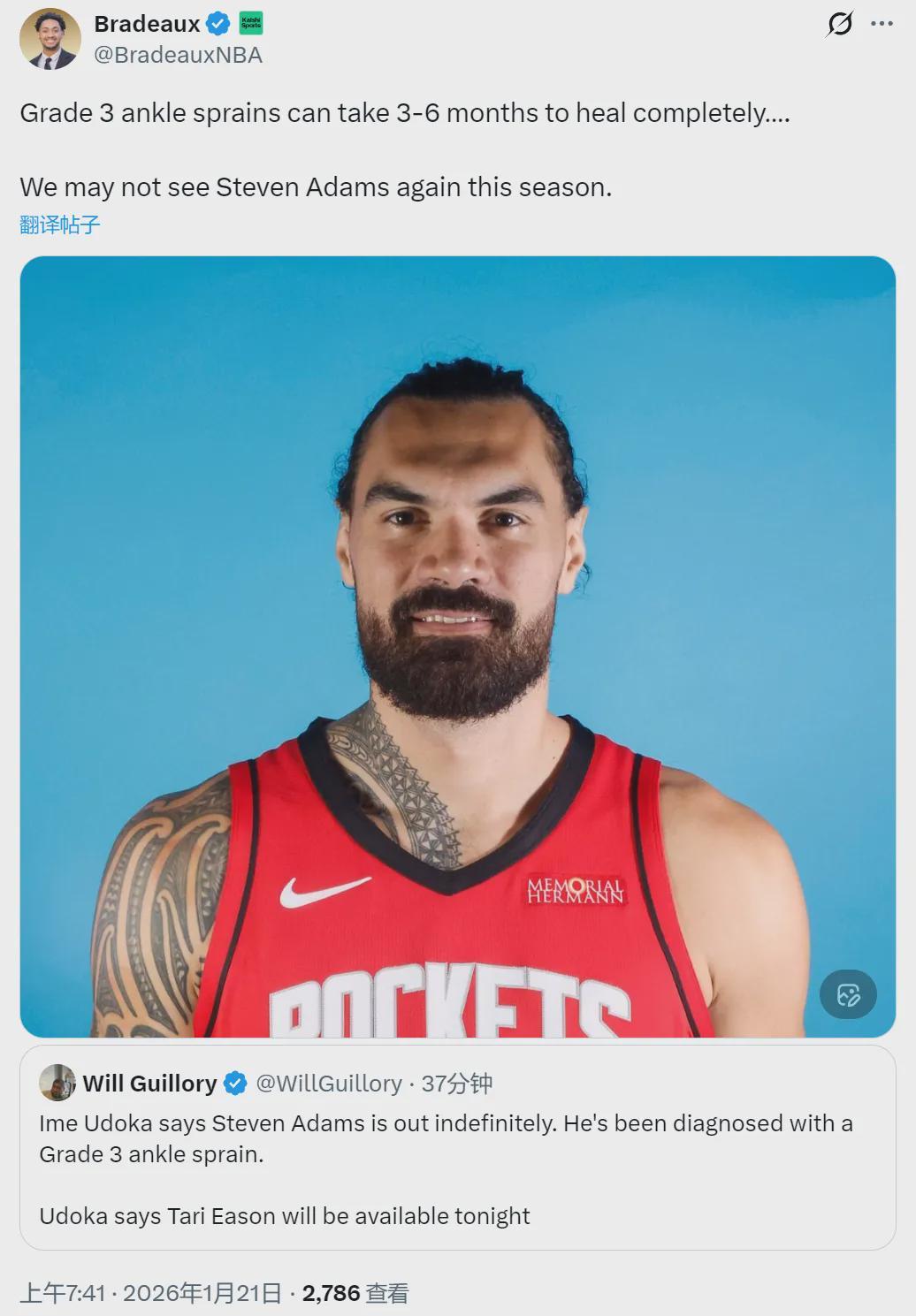 北京时间1月21日上午,火箭将在主场对阵马刺。据火箭随队记者Bradeaux报道,赛前火箭主帅乌度卡透露,球队中锋史蒂文-亚当斯遭遇了脚踝三级扭伤,将无限期休战。脚踝扭伤通常分为三个级别,三级扭伤是最严重的一档。常规赛仅剩2个多月,三级扭伤需要3-6个月才能完全恢复,这意味着亚当斯基本上常规赛报销了。乌度卡表示,球队还有卡佩拉,所以不用太担心内线问题。现在距...