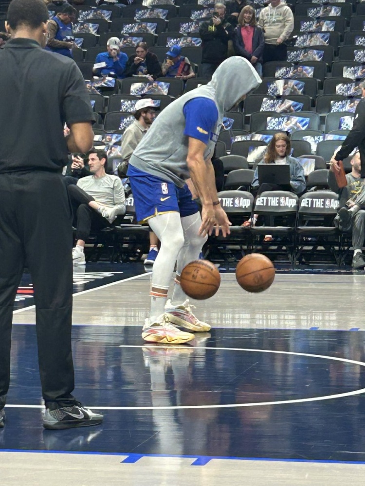 勇士球星库里今日赛前手持安踏欧文3代“中国新年”配色球鞋入场,并在训练中上脚。