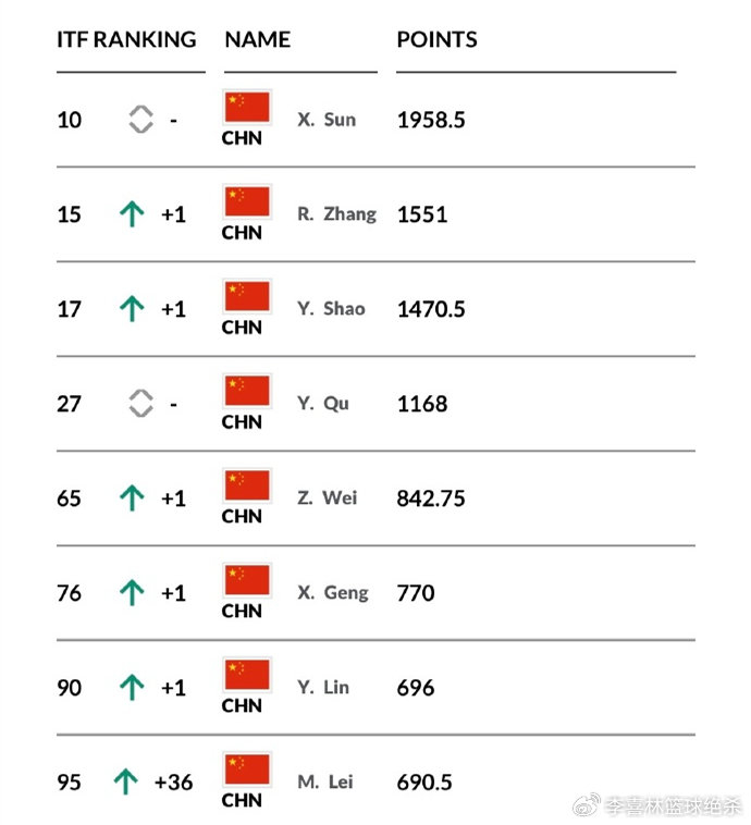 邵羽杉的青少年排名第17位,渠依含位列第27位。值得一提的是,孙心然、张瑞恩、邵羽杉和渠依含都打进了澳网青少年大满贯16强,其中孙心然和邵羽杉打进了八强。